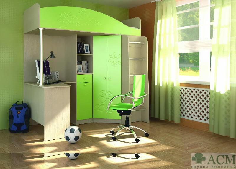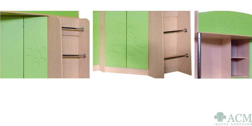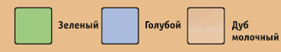 Материалы: Корпус ЛДСтП (цвет «Дуб»), кромка ПВХ. Фасады - фрезерованное МДФ в пленке ПВХ (Цвет «Зеленый» или «Голубой»), кромка ПВХ. Размер спального места кровати, мм: 800х1900
