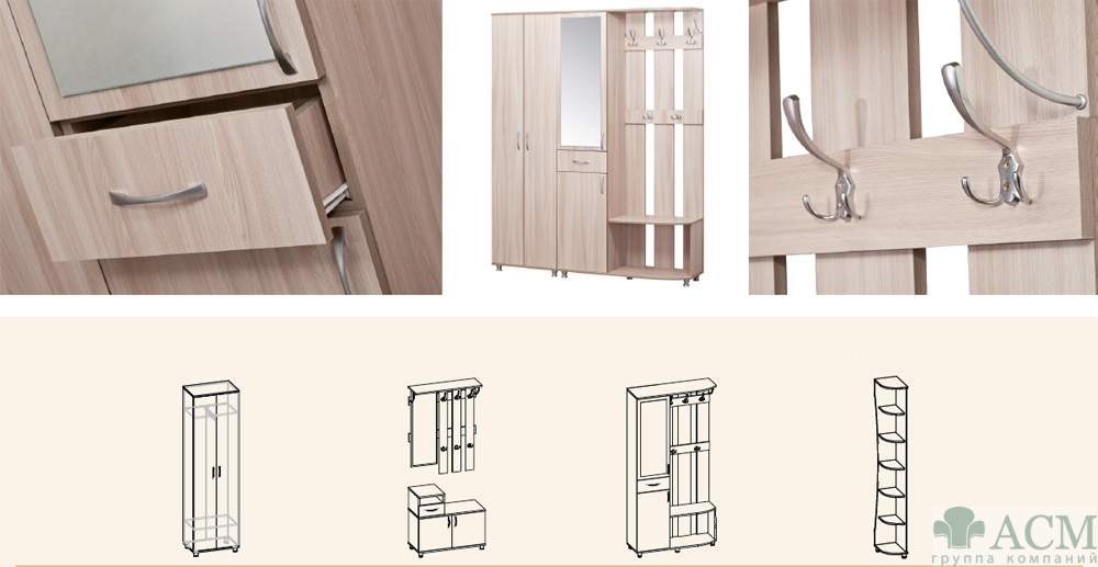 Материалы: Корпус и фасады - ЛДСтП, кромка ПВХ Шкаф для одежды ШОЗ Размеры, мм: 550х350х1950 Прихожая-1 ПВЗ-1 Размеры, мм: 800х350х1950 Прихожая-2 ПВЗ-2 Размеры, мм: 1000х350х1950 Регал ПРЗ Размеры, мм: 250х350х1950