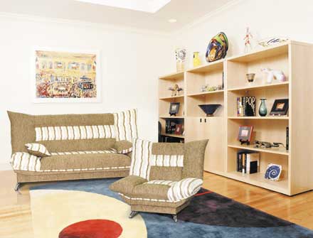 Современный молодежный дизайн с острыми формами контрастным кроем. Наличие подушек, отсутствие подлокотников.