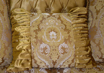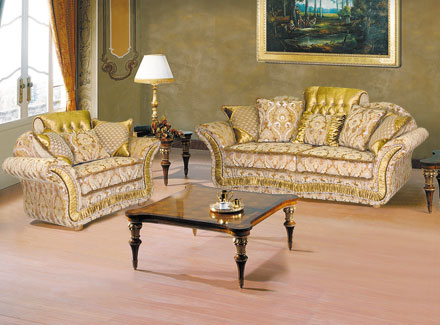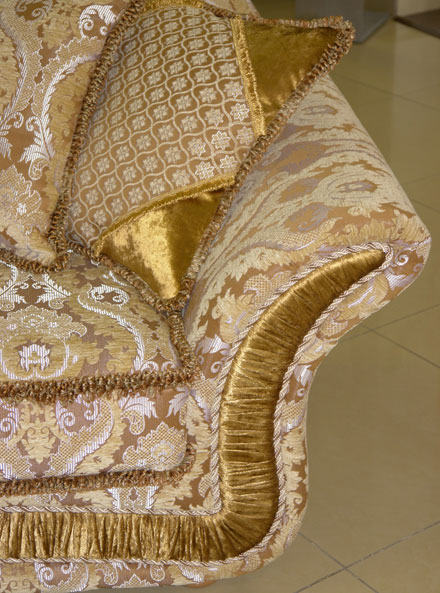 Величие и изящество присуще дизайну этого дивана, выполненного для интерьера в классическом стиле. Трехчастная форма спинки с центральной вставкой, отделанной стежкой «Капитоне» и бахромой создает эффект королевского трона. Оригинальные подлокотники с фигурной панелью, придают этой модели образ раскрытого цвтека. Удобные и мягкие приспинные подушки декорированы тесьмой и бахромой. В комплекте к дивану Вы можете заказать изящное кресло с декоративными подушками.